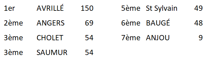 L’Ecole de Golf d’Avrillé remporte brillamment le Trophée (150 points), devant Angers (69), Cholet et Saumur (54), St Sylvain (49), Baugé (48) et Anjou (9). Comme évoqué lors de la dernière manche, une dotation va être attribuée à chaque AS correspondante, en regard de ce classement.